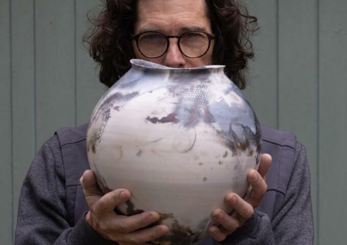 Huw’s work is hand thrown exploring the soft, pliable quality of clay. The finished pots are burnished with slip and saggar fired.