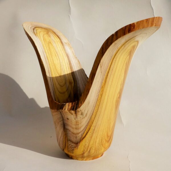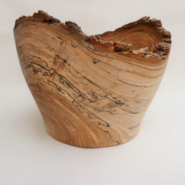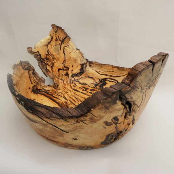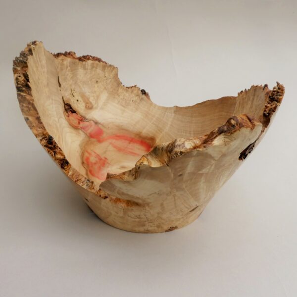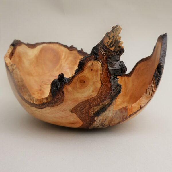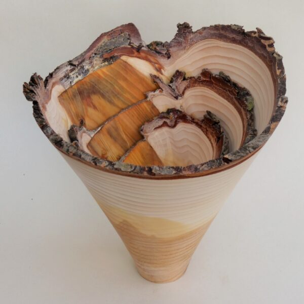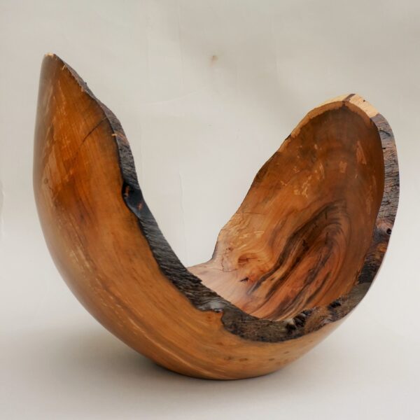 Most of the work is based on natural edged hollowed forms made from timber “in the round”. Simple shapes without decoration, colour or texture are used to allow the subtleties of the grain to come through. Bark, sapwood, staining, cracks and voids in the timber are often incorporated into a piece. The pieces are usually made from unseasoned timber which may distort as it dries out. Using a lathe imposes a circular geometry to a piece, mother nature then takes the shape back for herself ! This type of work is more about the timber than it is the woodturning.