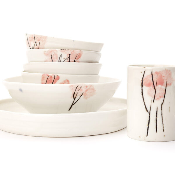 My work is thrown porcelain in a variety of sizes. I paint, score and splash surfaces, creating a feeling of spontaneity and movement.