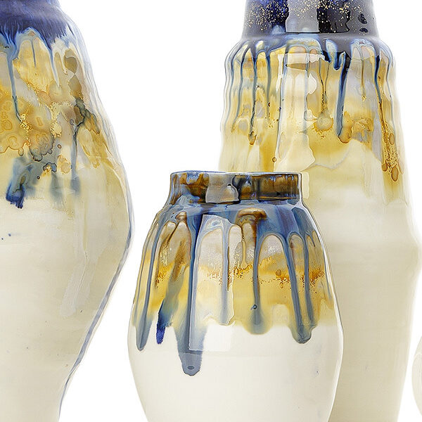 Laura’s background in Chemistry has helped in the creation of the multi-layered glaze combinations that melt at high firing with unique colour results. This is the main focus for Laura’s critical assessment of her work: the way the glaze runs and pools is the main part of the success of a piece.