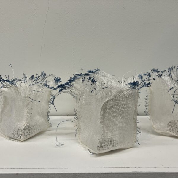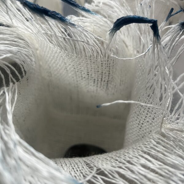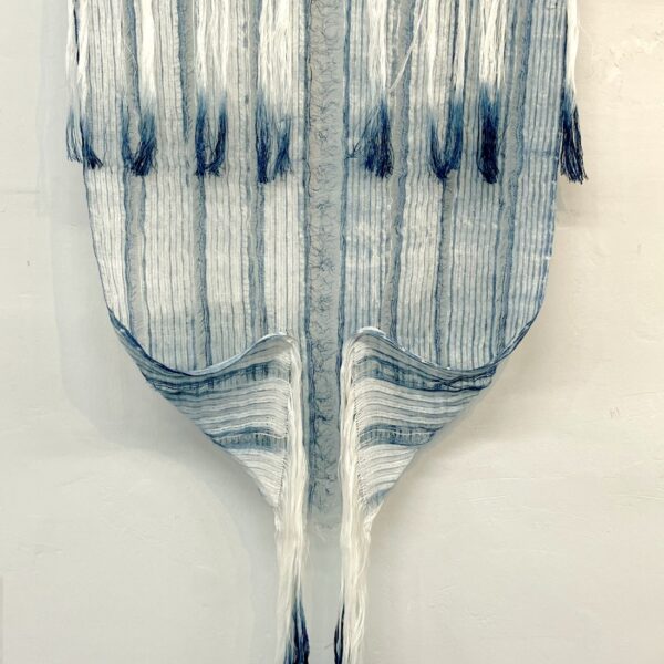 Researching archive maps & forgotten paths and the rhythm of walking, Sharon reminisces through the weaving of the warp and weft, a slowing of time; a narrative that conveys the land and our connection to it. Highlighting traditional hand weaving skills and the importance of natural materials, her love of indigo and rust shares the tales of both people and place, marking traces in time. Her weaving poses the question of the now and its importance in shaping the future, whilst reflecting on our past.