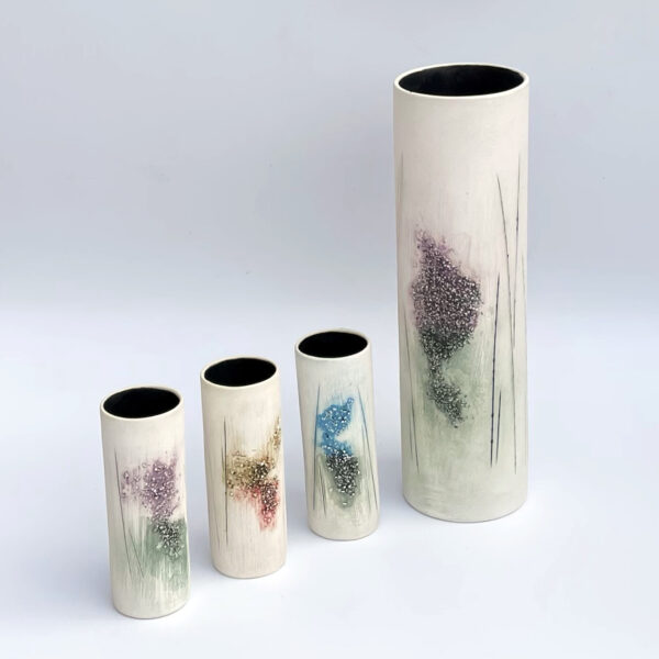 My work is thrown porcelain in a variety of sizes. I paint, score and splash surfaces, creating a feeling of spontaneity and movement.
